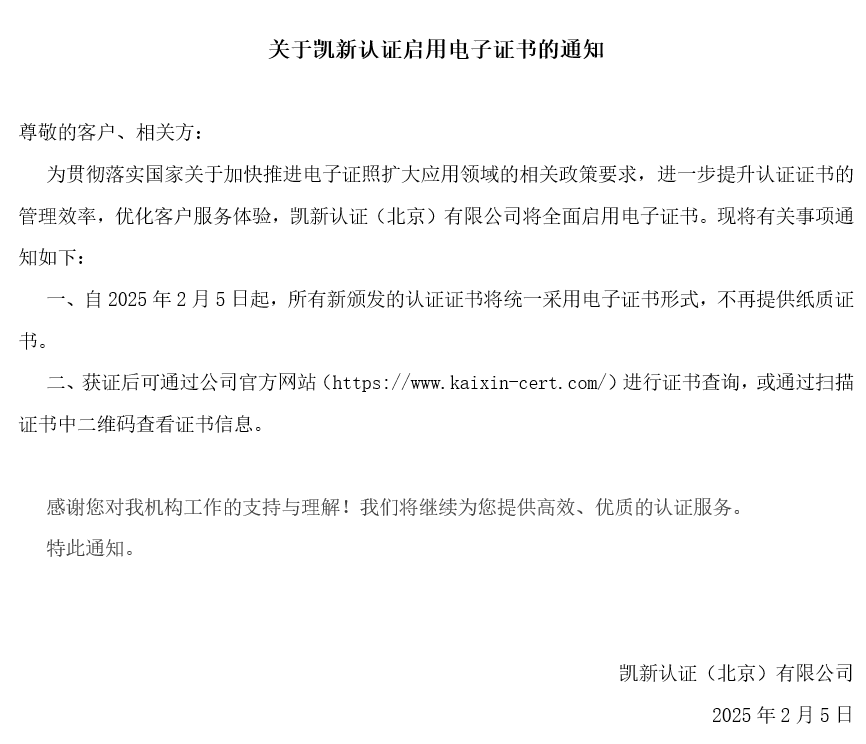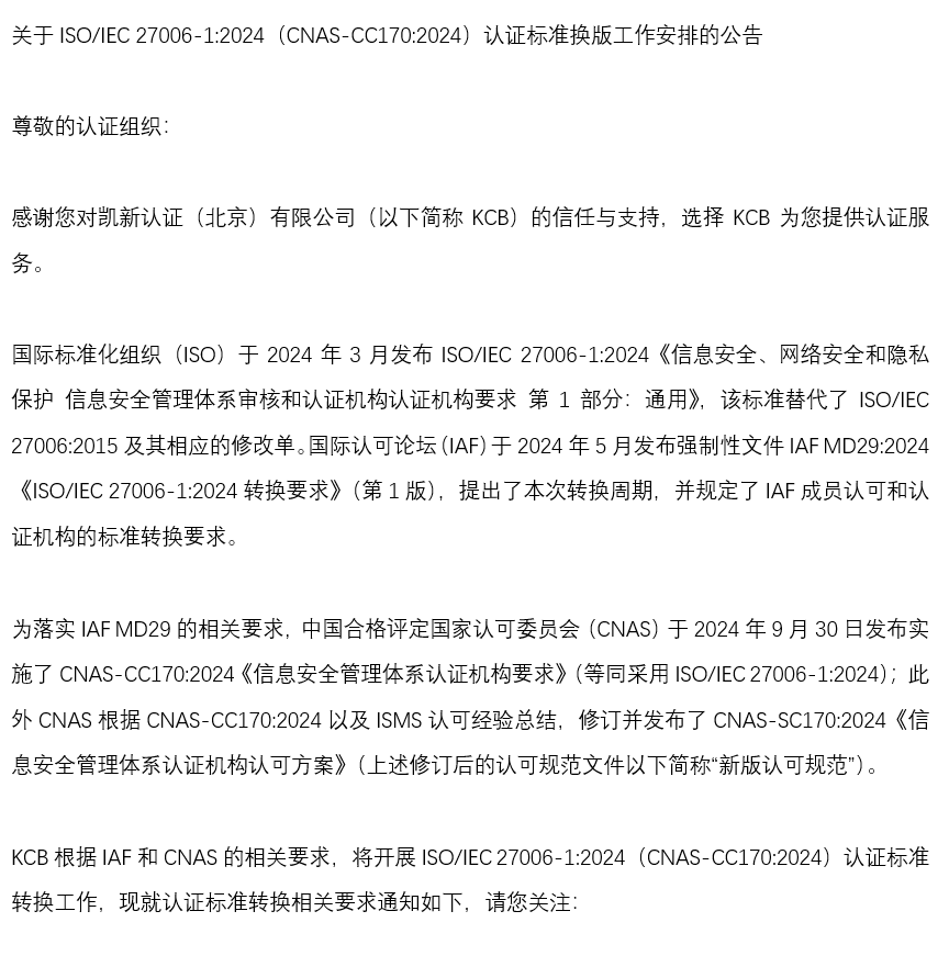2025.07.02凱新認(rèn)證(北京)有限公司順利通過(guò)ANAB FSSC 22000食品安全體系現(xiàn)場(chǎng)見(jiàn)證評(píng)審凱新認(rèn)證(北京)有限公司(以下簡(jiǎn)稱“凱新認(rèn)證”)成功通過(guò)美國(guó)國(guó)家認(rèn)可委員會(huì)(ANAB)對(duì)FSSC 22000食品安全管理體系的現(xiàn)場(chǎng)見(jiàn)證評(píng)審,并以零不符合的卓越表現(xiàn),彰顯其行業(yè)實(shí)力與專業(yè)水準(zhǔn)。2025.04.27關(guān)于凱新認(rèn)證(北京)有限公司變更的通知尊敬的客戶、相關(guān)方: 凱新認(rèn)證(北京)有限公司已于2025年4月22日完成公司股權(quán)變更、法定代表人變更、營(yíng)業(yè)執(zhí)照變更等手續(xù),成為中瑞集團(tuán)的全資子公司,由集團(tuán)北亞區(qū)副總裁李文江先生擔(dān)任凱新的法定代表人及總經(jīng)理。2025.03.28關(guān)于ISO/IEC 27006-1:2024(CNAS-CC170:2024)認(rèn)證標(biāo)準(zhǔn)換版工作安排的公告國(guó)際標(biāo)準(zhǔn)化組織(ISO)于2024年3月發(fā)布ISO/IEC 27006-1:2024《信息安全、網(wǎng)絡(luò)安全和隱私保護(hù) 信息安全管理體系審核和認(rèn)證機(jī)構(gòu)認(rèn)證機(jī)構(gòu)要求 第1部分:通用》,該標(biāo)準(zhǔn)替代了ISO/IEC 27006:2015及其相應(yīng)的修改單。國(guó)際認(rèn)可論壇(IAF)于2024年5月發(fā)布強(qiáng)制性文件IAF MD29:2024《ISO/IEC 27006-1:2024轉(zhuǎn)換要求》(第1版),提出了本次轉(zhuǎn)換周期,并規(guī)定了IAF成員認(rèn)可和認(rèn)證機(jī)構(gòu)的標(biāo)準(zhǔn)轉(zhuǎn)換要求。2025.02.25關(guān)于凱新認(rèn)證啟用電子證書(shū)的通知為貫徹落實(shí)國(guó)家關(guān)于加快推進(jìn)電子證照擴(kuò)大應(yīng)用領(lǐng)域的相關(guān)政策要求,進(jìn)一步提升認(rèn)證證書(shū)的管理效率,優(yōu)化客戶服務(wù)體驗(yàn),凱新認(rèn)證(北京)有限公司將全面啟用電子證書(shū)?,F(xiàn)將有關(guān)事項(xiàng)通知如下